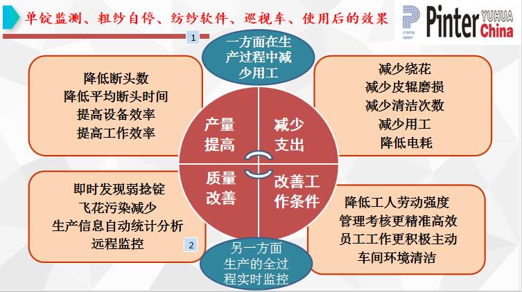 工作環(huán)境和勞動(dòng)強(qiáng)度的改變:使工作變的輕松,提高工人積極性,改變招工難的現(xiàn)狀。飛花減少,一方面有利于紗線質(zhì)量,另一個(gè)方面減少污染,環(huán)境得以改善,飛花減少,減少清潔次數(shù),增加車間的潔凈度。減少擋車工及保全工,降低用工成本。