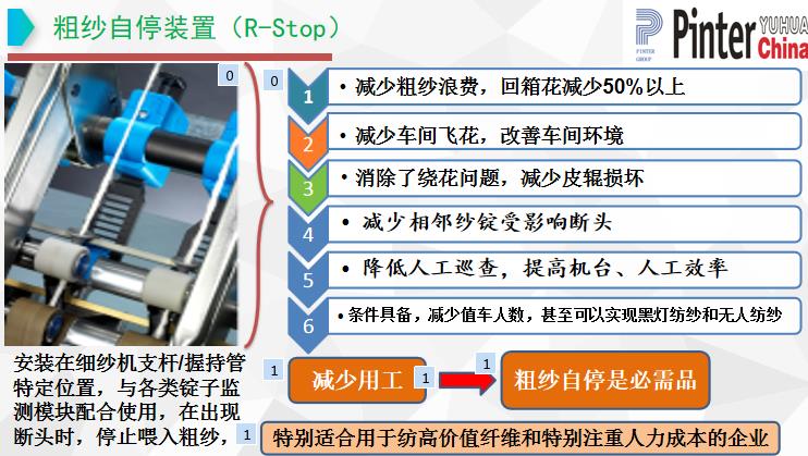 降低用工成本:監(jiān)測(cè)到斷頭可即時(shí)打斷粗紗,停止喂入,減少粗紗浪費(fèi)。由于即時(shí)停止粗紗喂入,減少回花,廢棉明顯降低。降低膠輥、皮圈和羅拉的維護(hù):粗紗自停裝置及時(shí)停止粗紗喂入,避免了纏繞,降低對(duì)膠輥、皮圈、羅拉的損害。減少擋車工及保全工,降低用工成本。